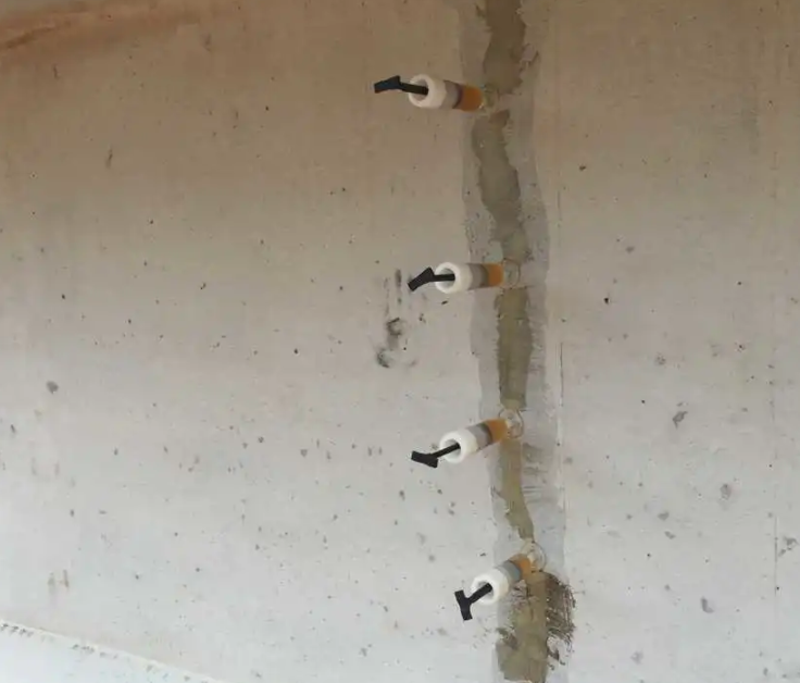 在裂缝的交错处、裂缝较宽处及裂缝端部等位置必须设置灌胶嘴。灌胶嘴的间距可根据裂缝大小、走向及结构形式而定。在一条裂缝上必须设置有进胶、排气或出胶口。灌胶嘴底座可先采用封胶粘贴在位置。
