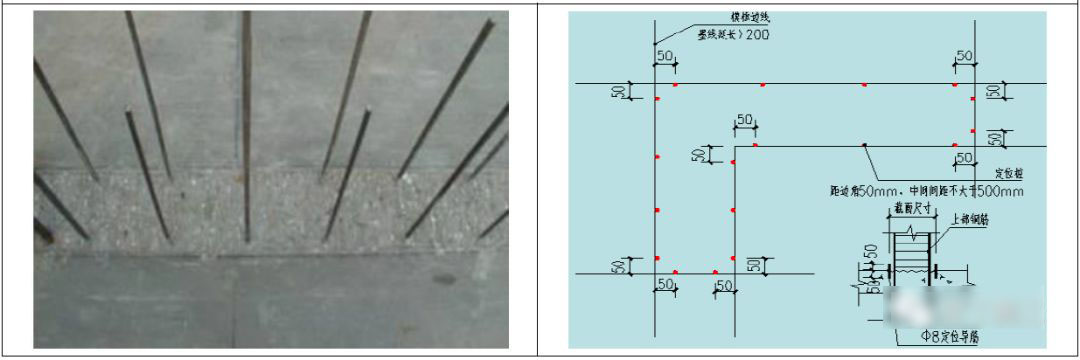 4.2 墙柱模板下口内侧需设ø 8定位筋,定位筋距模板阴阳角50mm开始设臵,间距≯500mm。
